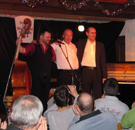 seine beiden Kollegen, die beiden Ex-Mojo´s Peter Müller am Schlagzeug und Dani Gugolz am Kontra-Bass taten ihres dazu, dass das Trio Szenen Applaus am laufenden Band bekamen. Sein außergewöhnliches Rhythmus Gefühlt zeigte Peter Müller bei “Rhumba Bounce“. Da legte er seine Sticks auf die Seite und trommelte mit seinen beiden Händen afrikanische Rumba Rhythmen. Dany Gugolz sang bei „Rock Bottom“ und pfiff gekonnt bei „Whistlin´Ouerselve the Blues“ die Melodie. Gegen Mitternacht holte dann Frank Muschalle, die beiden jungen Pianisten noch mal an das Klavier, und so wurde fleißig durchgewechselt bis zum Schluß doch tatsächlich 8 Hände auf die weißen Tasten hämmerten, denn auch Dani Gugolz spielte dann Klavier. |