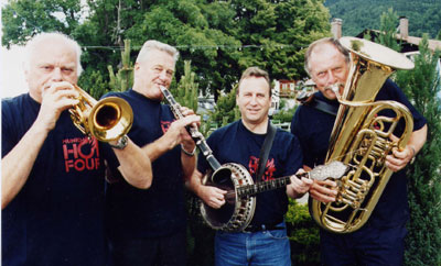 Hot Four wurden im Jahre 1982 von Wiggerl Niedermeier, dem ehemaligen Bandleader der bereits legendären bayerischen Jazz-Band "Hot Dogs" gegründet. Seit 1988 treten sie in der heute noch aktuellen Besetzung auf: Foto rechts v. links: Helmut Bindl (Trompete) Wiggerl Niedermeier (Klarinette, Gesang), Sigi Schaller (Banjo) und Goofy Essmann (Tuba) alternativ:Roland Höfner(Bass). |