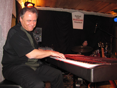 Robert Hacker. Vollblutmusiker durch und durch. Ein stummer Wimpernschlag genügte und der Rhythmus wurde entsprechend forciert oder gedrosselt. Die berühmten und auch weniger berühmten Nummern von Jerry Lee Lewis wurden mit eigenen Interpretationen und manches Mal auch mit Improvisationen versehen oder ergänzt. Der Mann an der Gitarre, Robert Hacker, charismatisch und humorig, holte aus den sechs Saiten eine Vielzahl an Facettenreichtum heraus, während Charlie Furthner gewohnt glückselig an seinem Keyboard das musikalische Repertoire hoch und runter spielte als ob er in seinem Leben noch nie etwas anderes gemacht hätte. Tastensicher und mit jeder Faser sich seiner Musik hingebend. |