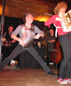 Kein Wunder also, dass sich das Publikum nicht nur mit einem eher seltenen Instrument konfrontiert, sondern auch einem sicherlich seltenen musikalischen Können. Eher wenige Jahre spielt die Anja Baldauf den Zydeco Musikstil mit seinen Ursprüngen in den Sümpfen Louisianas. Aber das merkt man eigentlich nicht. Mit strahlendem Lächeln und in bester Laune tobt die Annie über die Bühne und haut ein Stück nach dem anderen hinaus. Bei diesen Mitmusikern würde aber auch anderes nicht gehen. Ihre „rechte Hand“ - wie sie sagt - ist der Sänger und Percussonist Rolf Berger, ein Mann mit ordentlich Schalk im Nacken. Seine weite, sichere, sehr variantenreiche Stimme trägt gerade im ersten Teil des Abends viele Stücke. Sein Minenspiel ist eines Schauspielers würdig und gepaart mit dem Schalk gab es fürs Publikum reichlich zu lachen. |