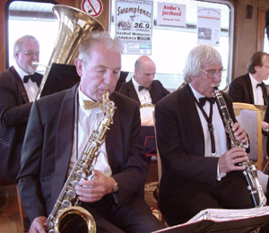 Das Deck der MS Edeltraud verwandelte die Andors Jazzband zwischenzeitlich in einen Ballsaal. Was andernorts Bigbands entstehen ließ, benötigte hier aber nur neun Vollblutmusiker, deren Instrumentenfundus allerdings zur Ausstattung einer kleinen Bigband gereicht hätte. |