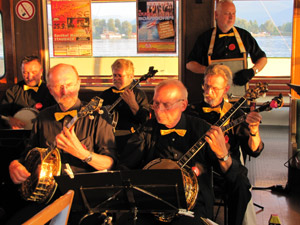 | 18 Männer, 16 Banjos, ein Frau: die Münchner Banjo-Band auf dem Zwischendeck. Dass gleiche Instrumente nicht gleiche Töne bedeuten, erst recht keine eintönigen Melodien, begeisterte das Publikum. Überraschungen, wie das im Spiel mehrfach umgestimmte Fünf-Saiten-Banjo, die duellierenden Banjos, der Skiffle mit dem herausgestellten Banjo mit Skiffle-Kopf machten das mit | ![]() |