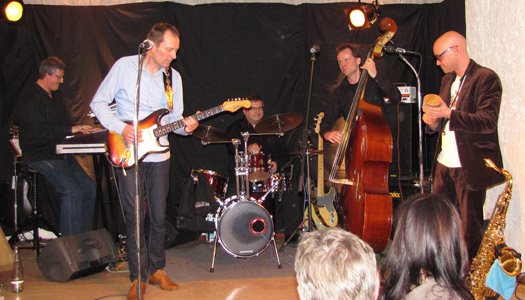 The Dice“. Georg Meier brillierte an der Gitarre, Peter Lechner liess sein Saxophon röhren was seine Lungen hergaben, Christian von LeSuire zupfte den Bass und Peter Janotta sorgte für den perfekten Rhythmus an den Drums. Am Keyboard war erstmals Markus Reiter eingesprungen. Er spielte so als sei er schon immer der Pianist dieser Band, dabei ist er ja der Pianist von Sauerkirsch, die dann auch den dritten Set bei diesem Mini Festival gestalteten. |