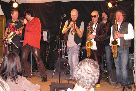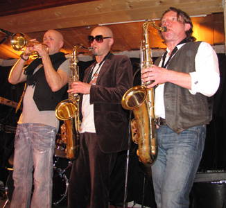 die 8 Musiker einige ihrer Rock `n` Soul Klassiker in bayerischem Dialekt. Besonders harmonierten dabei die drei Bläser Sepp Lechner (Trompete), Peter Lechner der 1. ( Saxophon) und Franz Pichl (Saxophon) mir einem vollem Big Band Sound. Auch hier sorgte Peter Janotta am Schlagzeug und Peter Lechner der 2. am Bass für einen grandiosen Groove. Martin Wilhelm führte wieder beschwingt und mit viel Spontanität durch den Rest des Abends. Erst weit nach Mitternacht verabschiedeten sich die Band von einem begeisterten und glücklichen Publikum und keiner hat mehr daran gedacht, dass das geplante Konzert eigentlich ausgefallen war. |